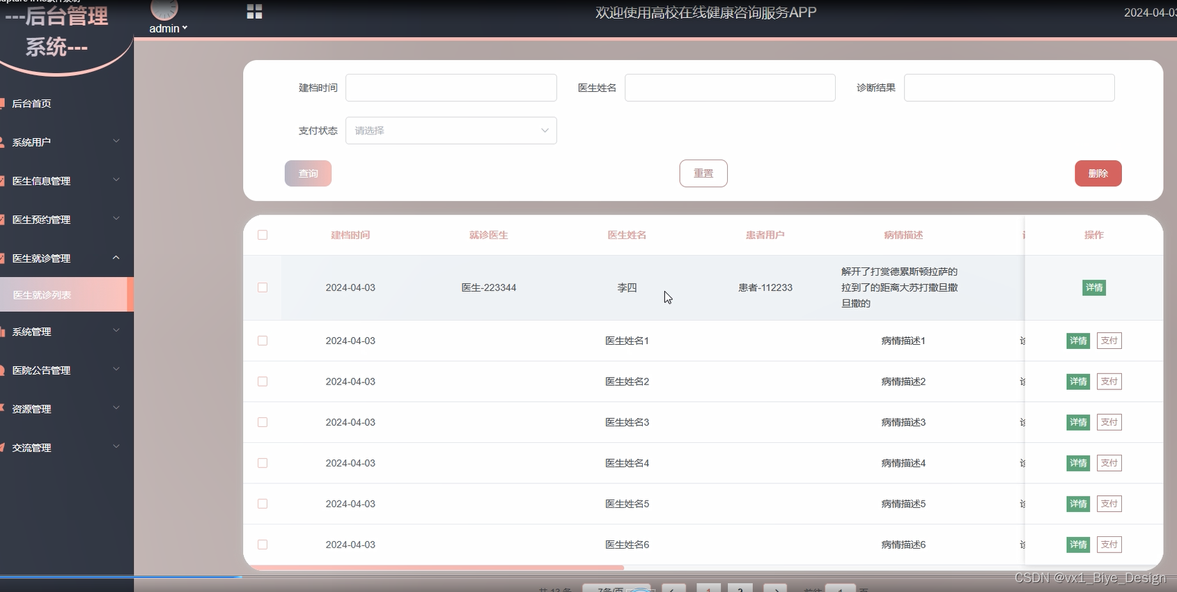 管理员可以管理医生的诊疗记录,包括患者就诊情况、诊断结果等信息,以确保诊疗过程的记录和管理。界面如下图4-11所示。