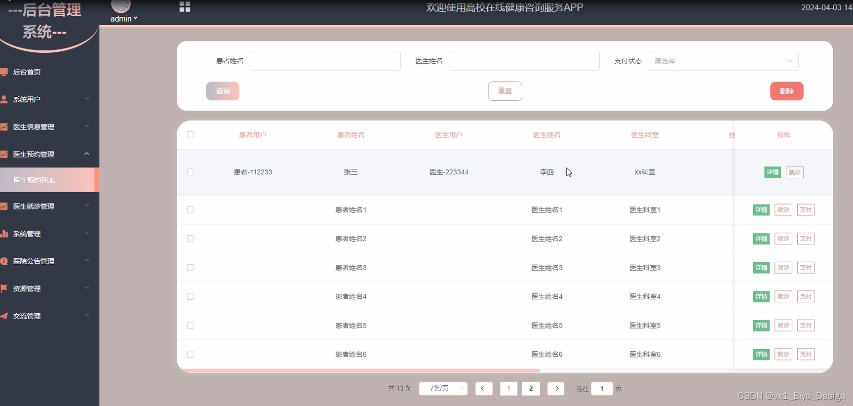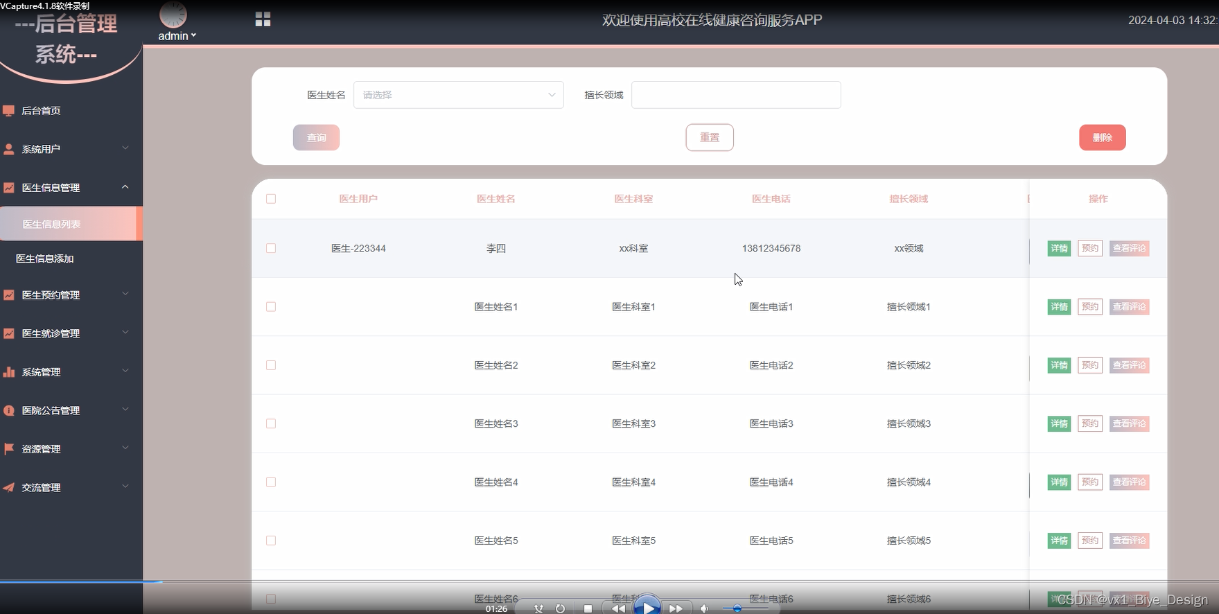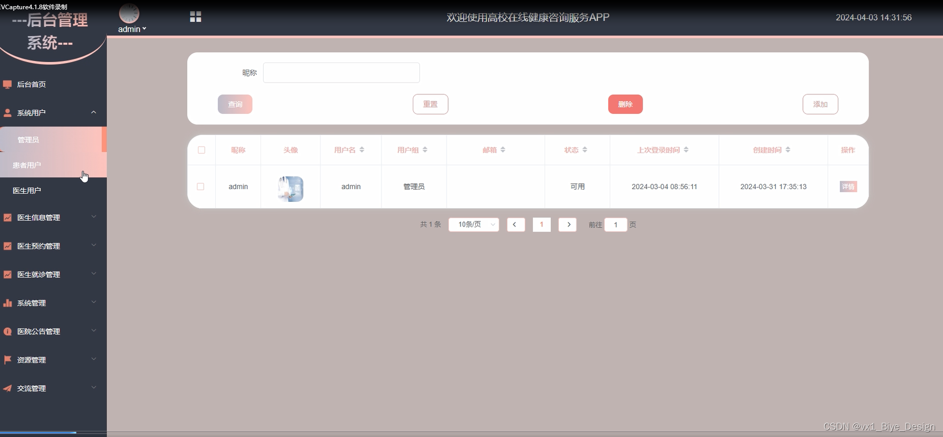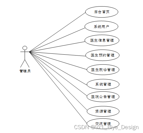 5.管理员功能,管理员可以对系统用户、医生信息管理、医生预约管理、医生就诊管理、系统管理、医院公告管理、资源管理、交流管理等进行管理。