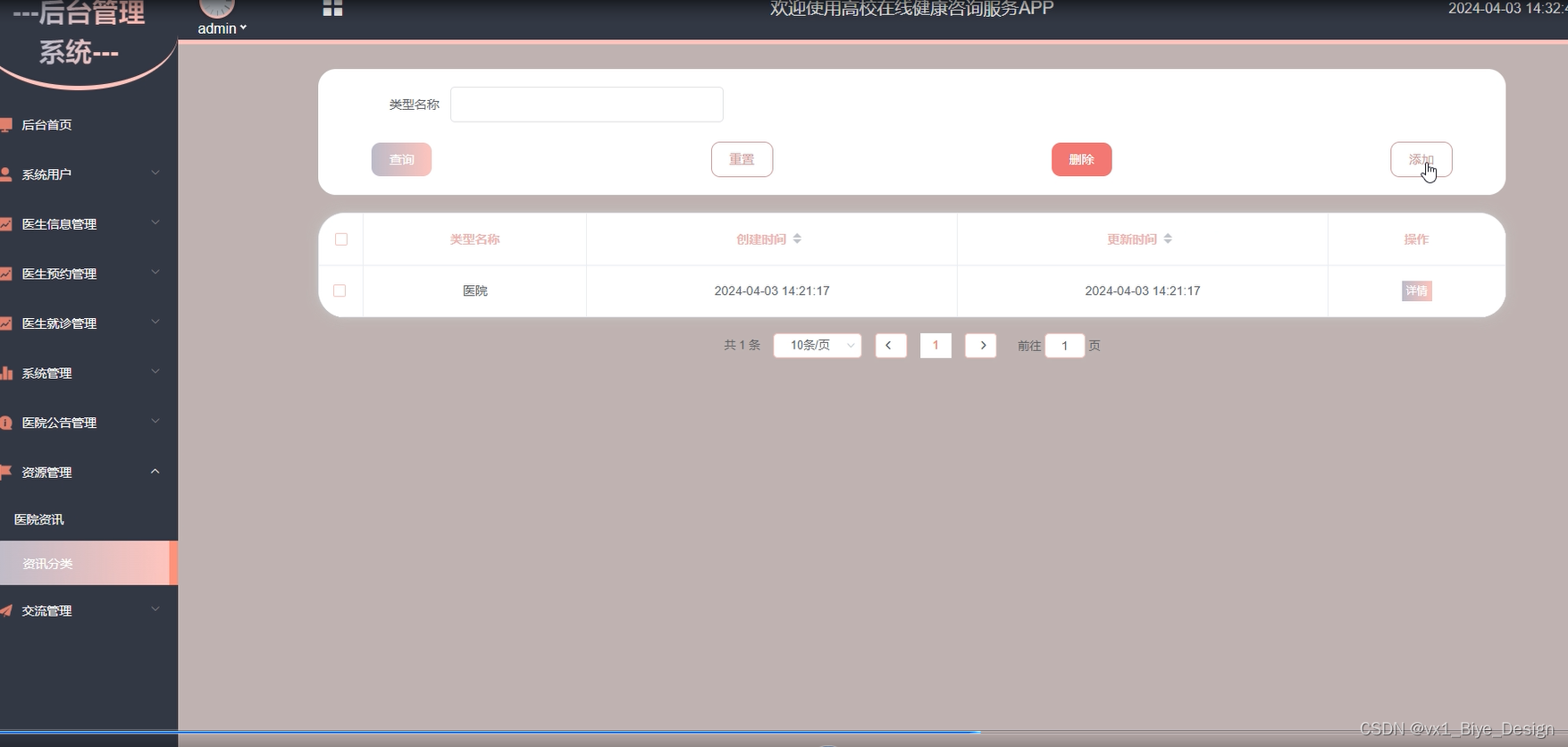 资讯分类:管理员可以管理医院资讯的分类,包括添加新分类、编辑分类、删除分类等操作,以维护资讯信息的组织和管理。界面如图4-15所示。