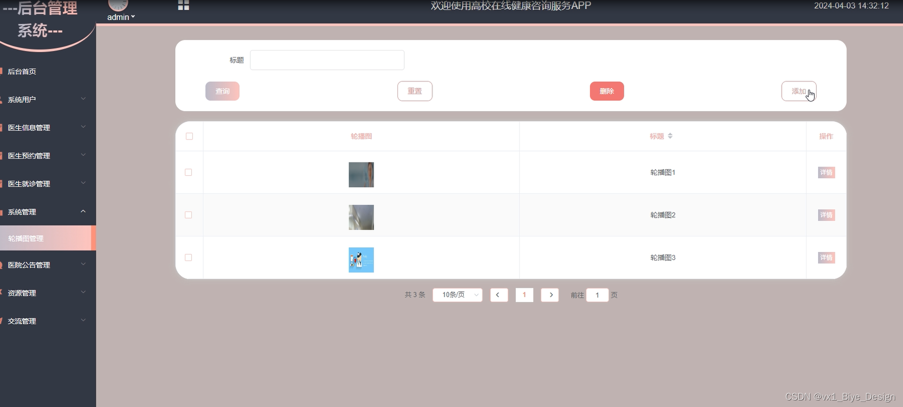 管理员可以对系统前台展示的轮播图进行增删改查,方便用户进行查看。轮播图管理界面如下图所示。界面如下图4-12所示。