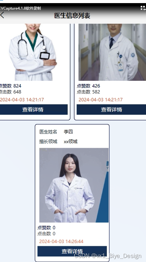 用户点击“医生信息”这个菜单,可以查看到系统中所有添加的医生信息,支持通过筛选、排序、局部搜索等方式进行查询,如果想要了解某一的医生信息的详细信息,点击即可进入详情查看界面,详情页面可以对医生信息进行查看、预约、点赞、评论等操作。界面如下图4-5所示。