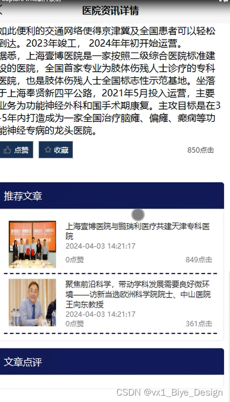 医生用户可以查看医院相关的资讯内容,包括医院动态、科室介绍、医生排班等,方便医生了解医院信息和就诊流程。在详情页面可以点赞、收藏和评论。界面如4-6所示。