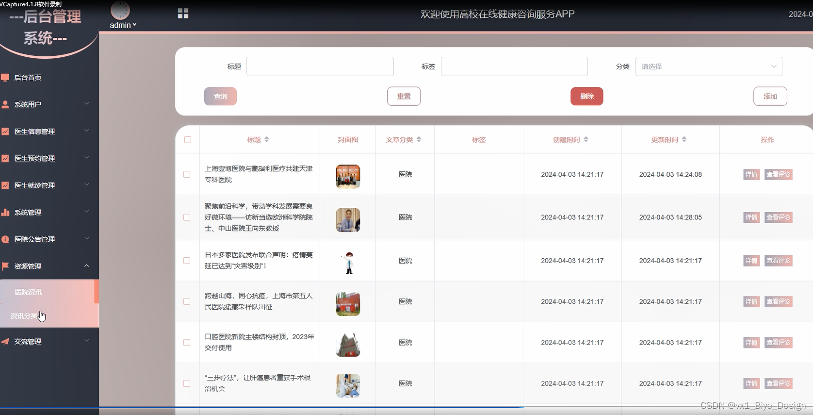 医院资讯:管理员可以管理医院资讯的发布和分类,包括添加、编辑、删除资讯内容,以便及时传达给患者用户。界面如图4-14所示。