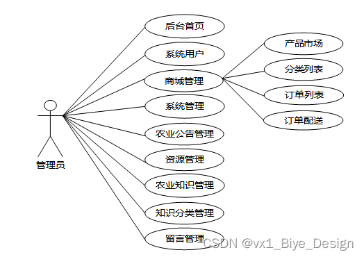 管理员是维护整个基于SSM的三农产品助推网站中所有数据信息的。管理员角色用例如图2-4所示。