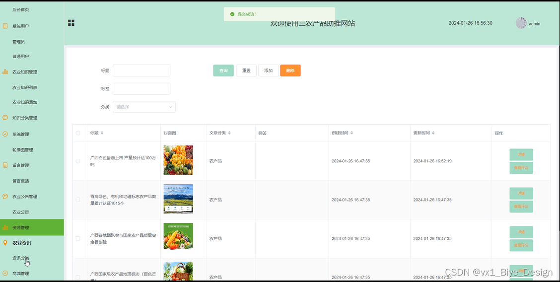 管理员点击“农业公告管理”菜单,管理员可以查看和管理网站上的所有农业公告信息,包括添加、修改或删除农业公告等操作,界面如下图所示。