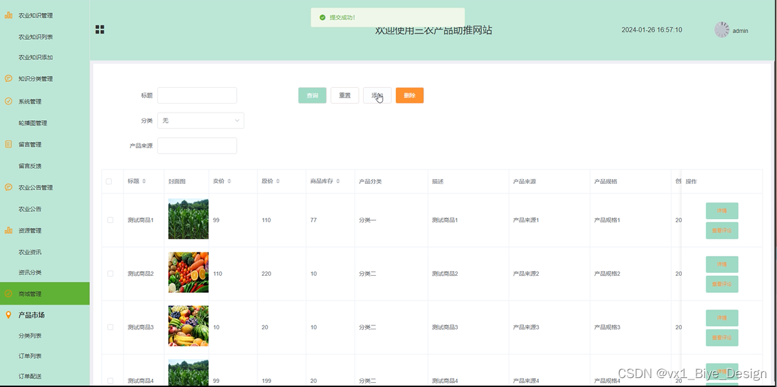管理员点击“产品市场”菜单,管理员可以管理平台中的三农产品商品信息,包括添加、编辑和删除商品。界面如下图所示。