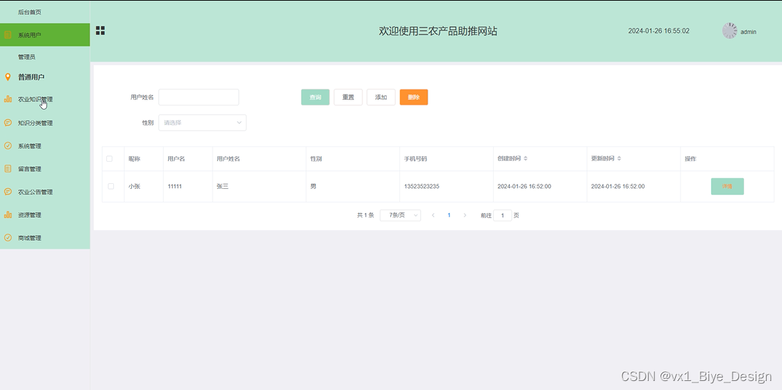 基于SSM的三农产品助推网站中的管理人员是可以对注册的普通用户进行管理的,也可以对管理员进行管控。界面如下图4-10所示。