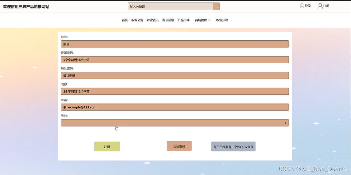 首页: 展示农产品市场、农业公告、农业资讯等内容,吸引用户关注。