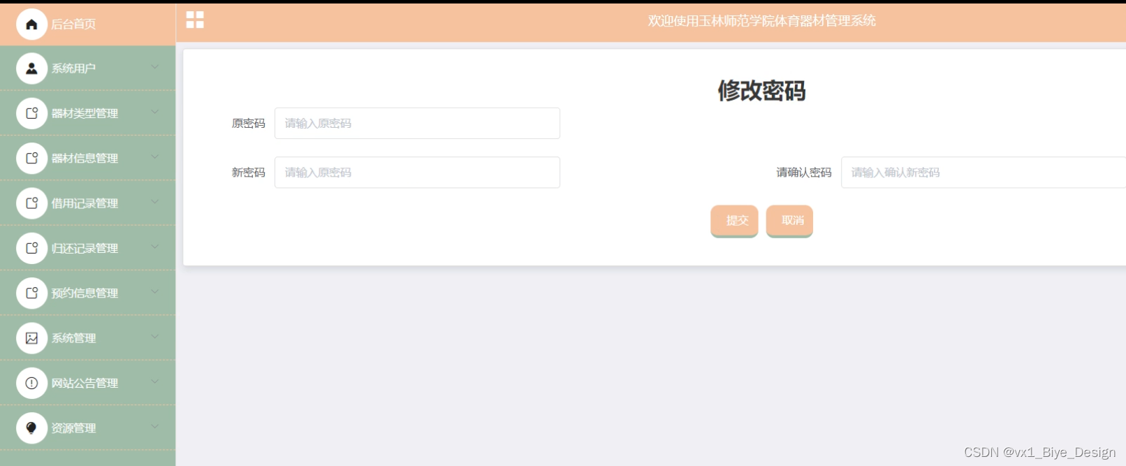 用户使用该玉林师范学院体育器材管理系统注册完成后,用户对登录密码有修改需求时,系统也可以提供用户修改密码权限。系统中所有的操作者能够变更自己的密码信息,执行该功能首先必须要登入系统,然后选择密码变更选项以后在给定的文本框中填写初始密码和新密码来完成修改密码的操作。在填写的时候,假如两次密码填写存在差异,那么此次密码变更操作失败,下面的图片展示的就是该板块对应的工作面。