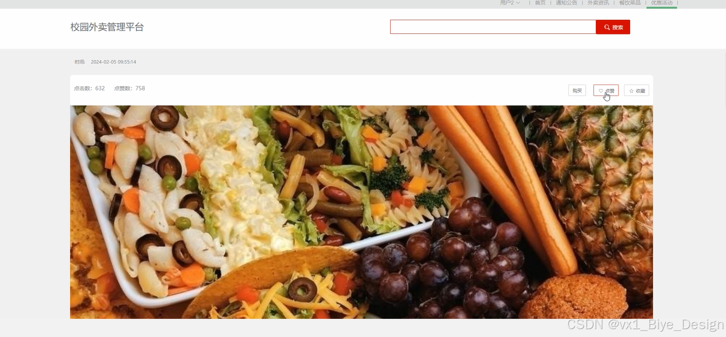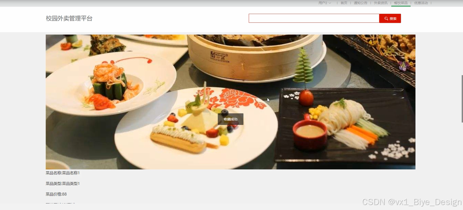 (4)餐饮菜品:用户进行餐饮菜品的阅览,通过查询餐饮菜品,可对某一个餐饮菜品进行点赞+评论+收藏。