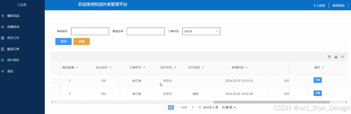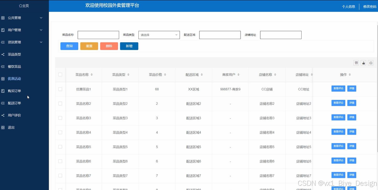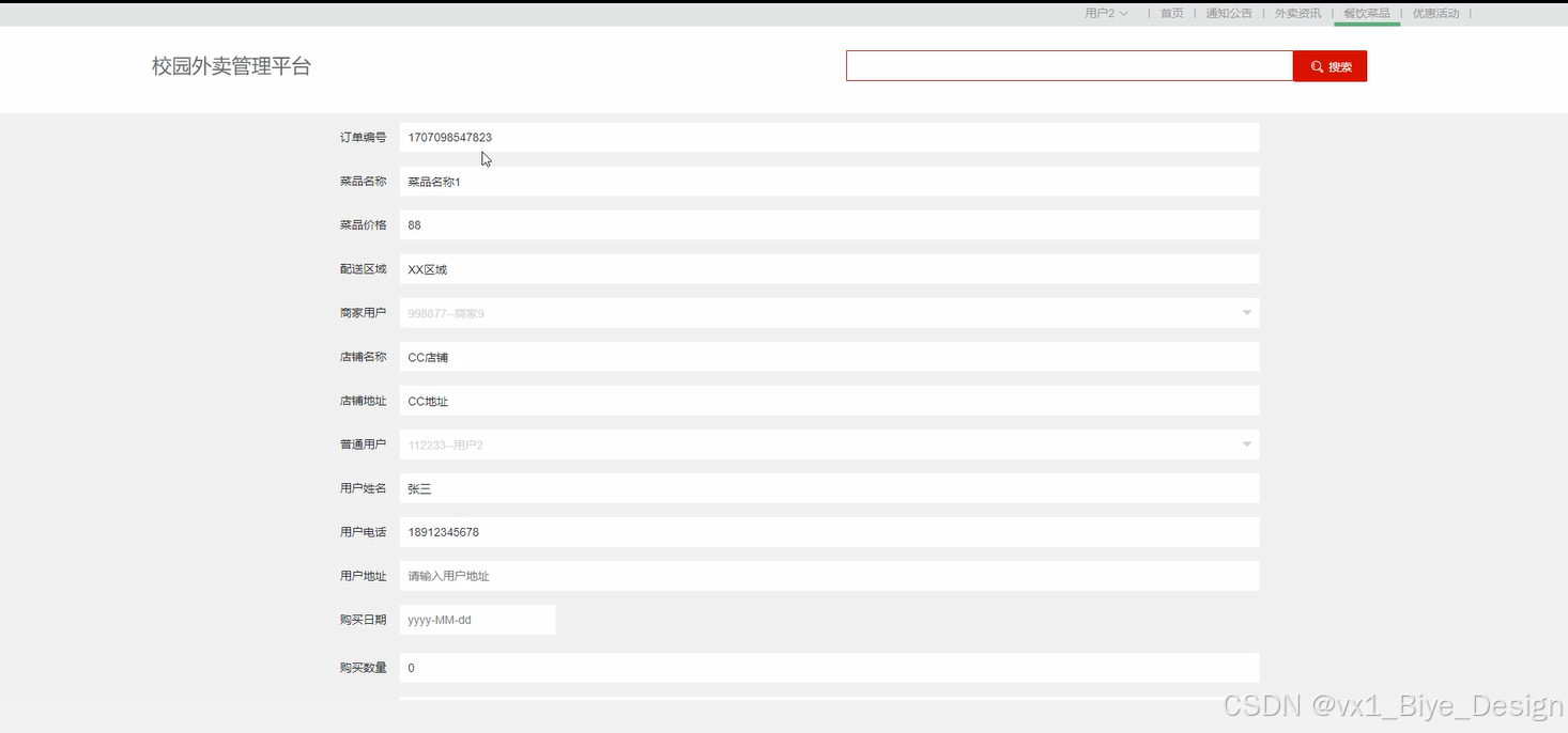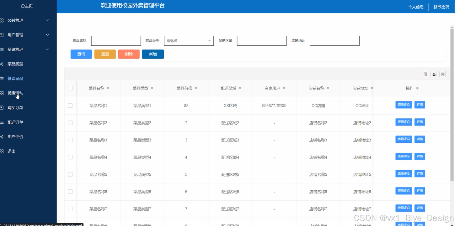 With the increasing demand for food on and off campus and the booming development of the food delivery market, design and implement a campus food delivery management platform based on the SSM (Spring+SpringMVC+MyBatis) framework. To meet the demand for sales services both on and off campus. The platform includes multiple roles such as administrator, regular user, merchant user, and delivery rider, and includes functional modules such as catering dishes, promotional activities, purchase orders, delivery orders, and user reviews. The platform is developed using the SSM framework, utilizing its excellent integration capabilities and strong scalability to achieve front-end and back-end separation and flexible business logic processing. Through database support, store and manage user, dish, order, and other related data to ensure system stability and data security.