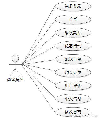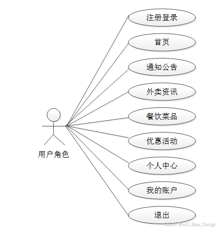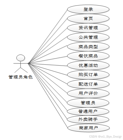 通过2.3功能的分析,得出了本校园外卖管理平台的用例图: