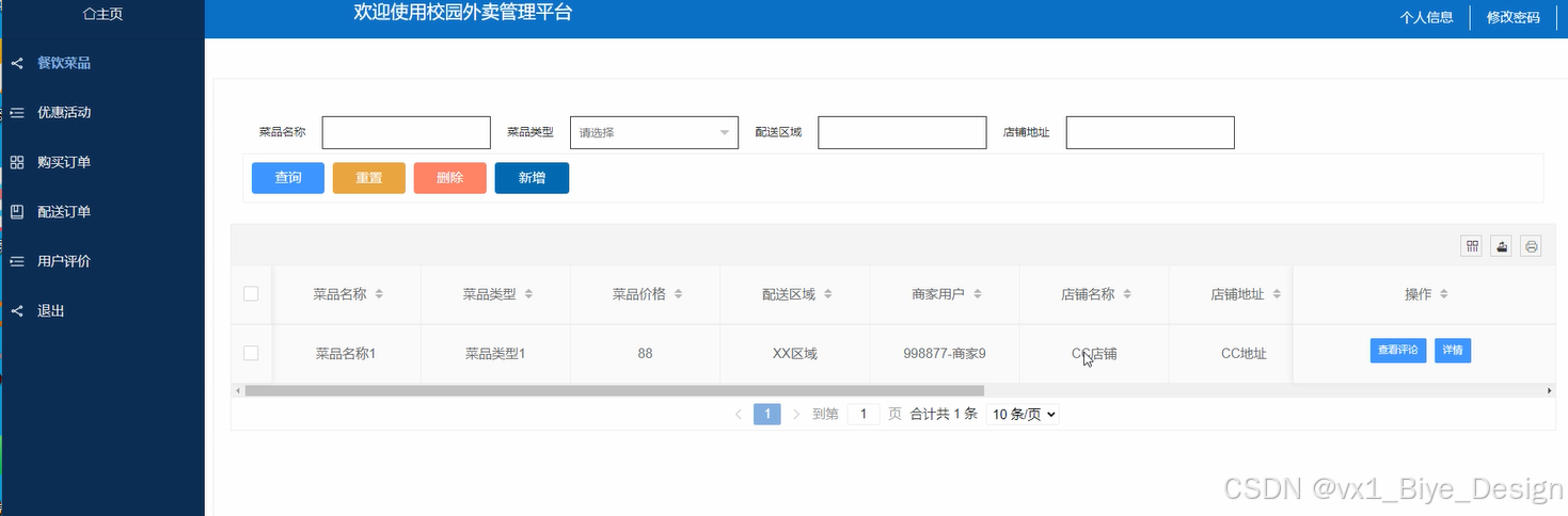 (1)餐饮菜品:商家点击“餐饮菜品”菜单可以对餐饮菜品进行增删改查。
