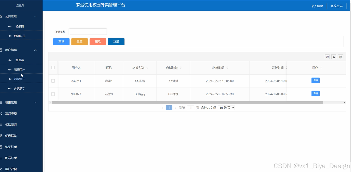(2)用户管理:管理员点击“用户管理”这一菜单会显示管理员+普通用户+商家用户+外卖骑手这四个子菜单,管理员可以对这四个角色的信息进行增删改查操作。