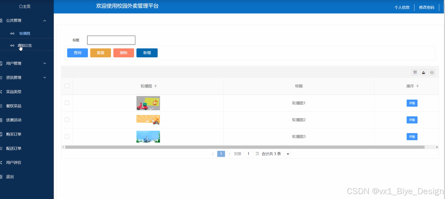 (6)公共管理:管理员可以对系统前台展示的轮播图以及公告进行增删改查,方便用户进行查看。
