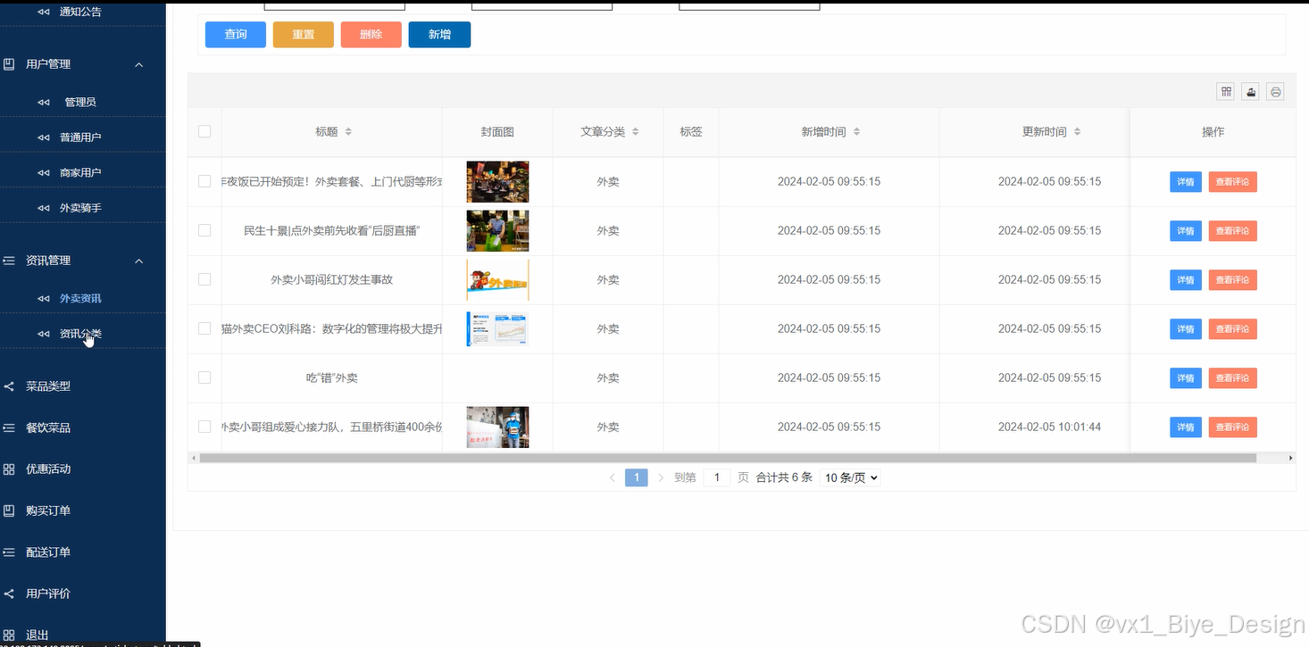 (7)资讯管理:管理员在后台可以对校园外卖管理平台中显示的外卖资讯以及资讯分类进行增删改查。