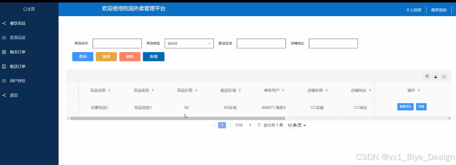 商家在“餐饮菜品”这一界面能够查看自己提交的餐饮菜品信息,可以进行增删改查操作,也可以对前台用户提交的优惠活动评论进行管控,优惠活动界面如下图4-17所示。