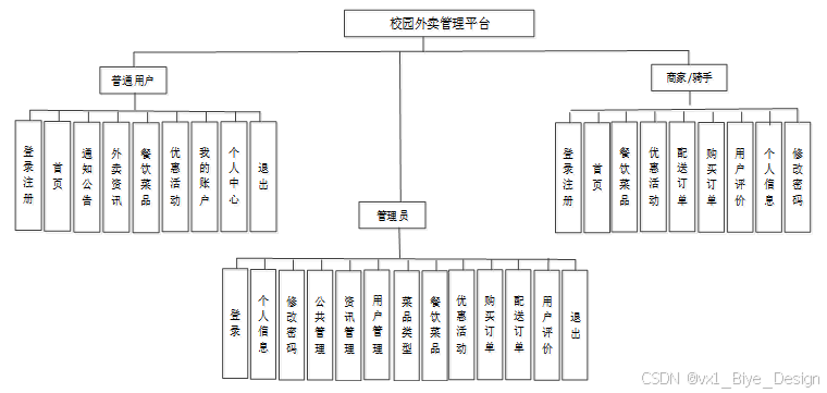 按照校园外卖管理平台的角色,我划分为了管理员模块+商家用户模块+普通用户模块+外卖骑手模块这大部分。