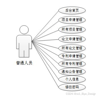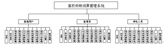 根据用户对系统的需求,要求系统简单操作,能够准确,完整的对信息进行管理。对高校科研成果管理做需求做解析后,划分为了普通用户、审批人员和管理员这三大功能板块。