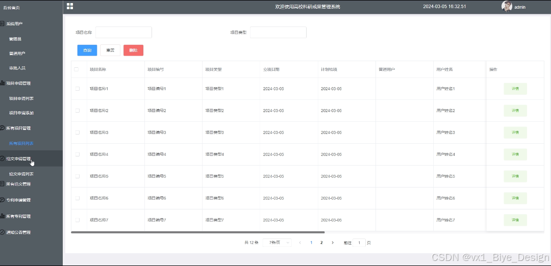 - 所有项目管理:可查看所有项目信息,进行查询和删除操作,支持项目名称、项目类型搜索,点击可查看详情。