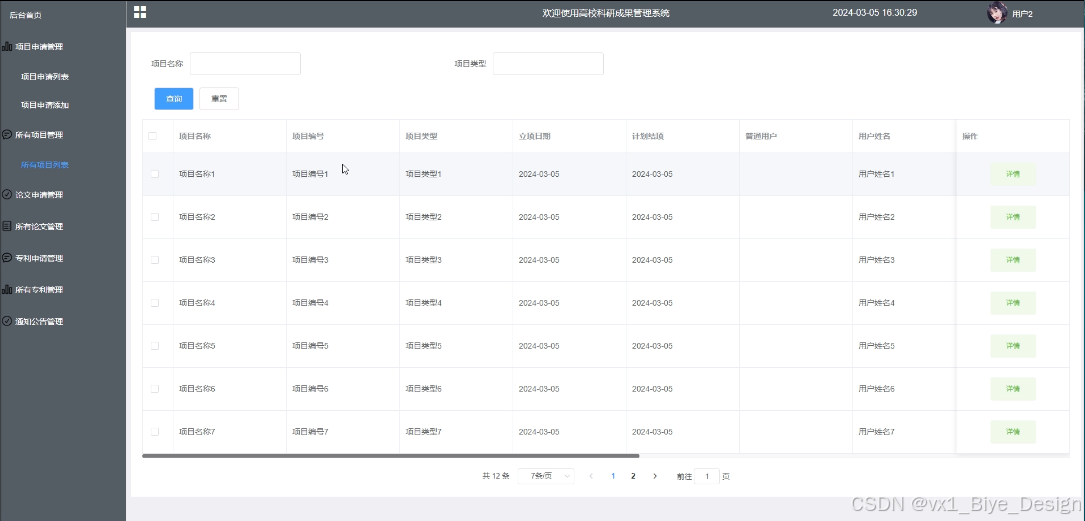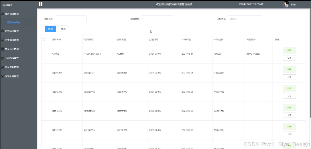可查看所有提交的项目申请信息,进行增改删查操作,支持项目名称、项目类型、审核状态搜索,可点击查看详情(项目名称、项目编号、项目类型、立项时间、计划结语、申请经费、普通用户、用户姓名、学院名称、参与人员、项目详情、项目文档、项目进度、审核状态)和进行审核,并可点击进行公布操作。其界面如下图所示。