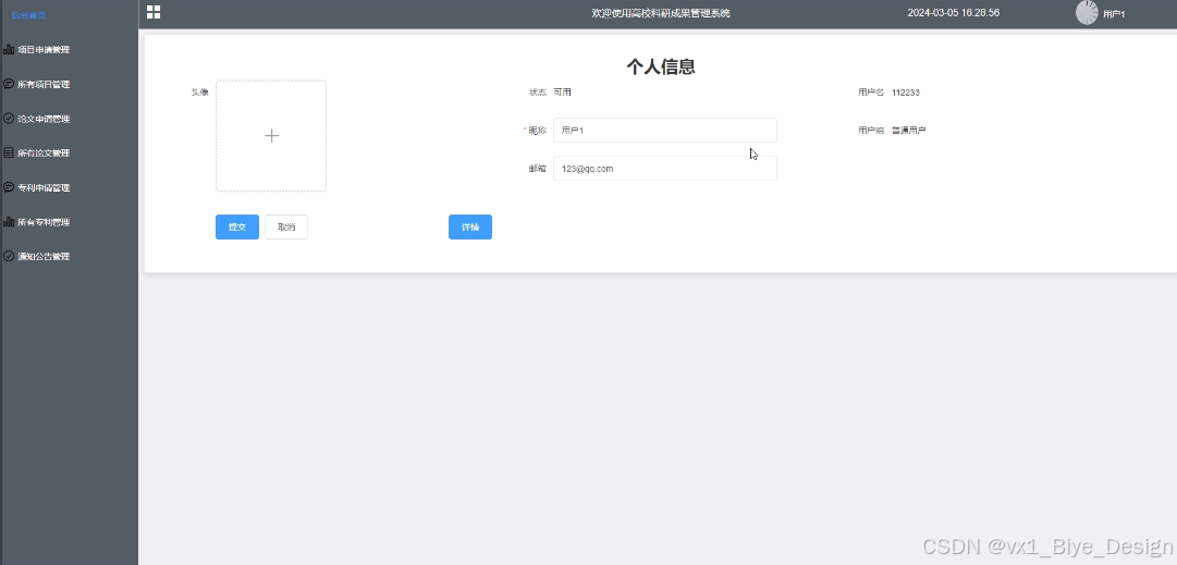 - 系统用户:可对普通用户、审批人员和管理员进行管控,包括进行增删改查操作,点击可查看详情(头像、账号、密码、昵称、邮箱、状态、姓名、性别、电话)。