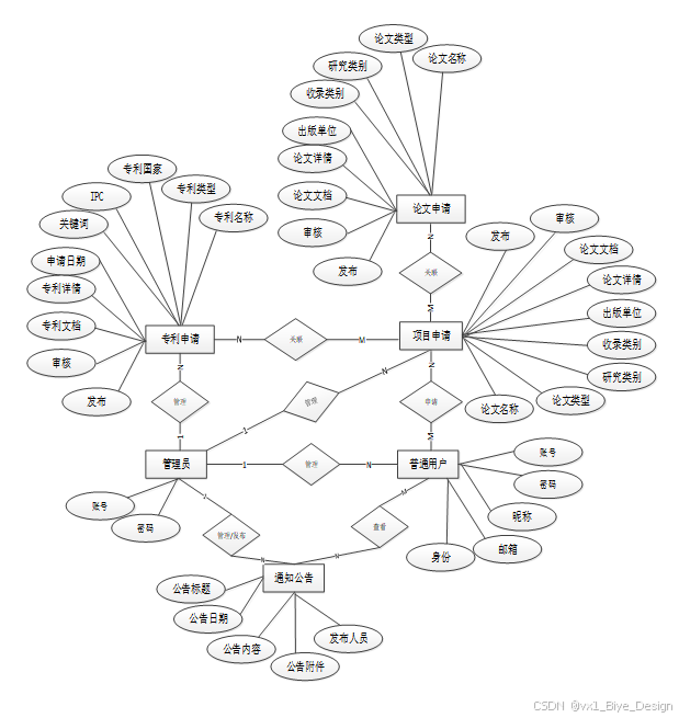 下面是整个高校科研成果管理系统中主要的数据库表总E-R实体关系图。