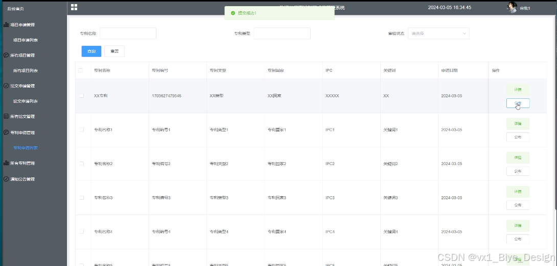 - 所有专利管理:可查看所有专利信息,进行查询操作,支持专利名称、专利类型、批准日期搜索,点击可查看详情。