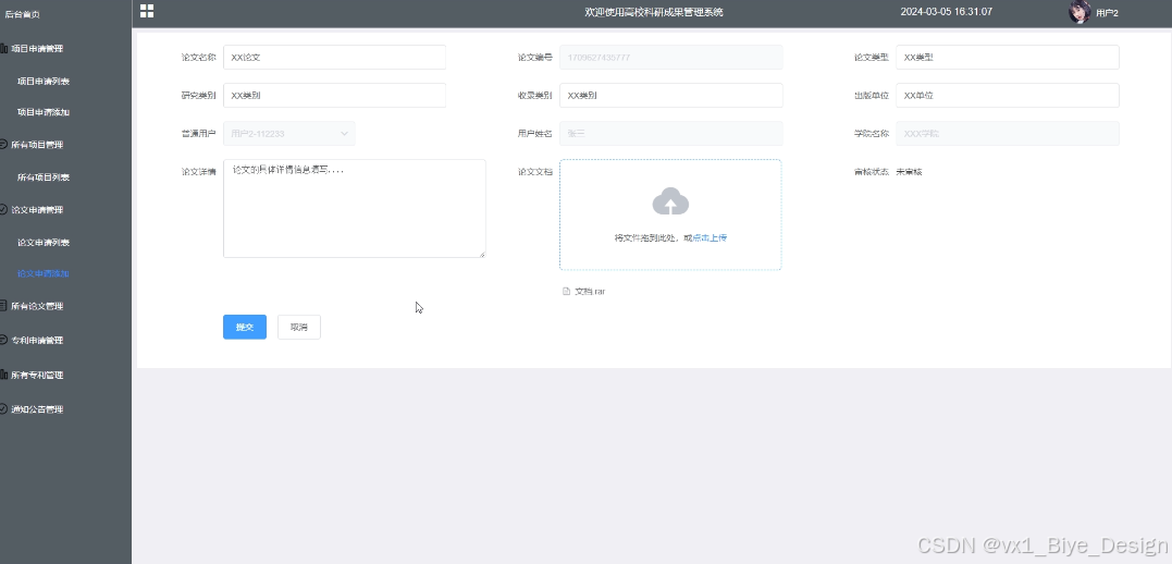 可查看提交的论文申请信息,进行增改删查操作,支持论文名称、论文类型、审核状态搜索,添加提交项目申请信息(论文名称、论文类型、研究类别、收录类别、出版单位、论文详情、论文文档)等待审核,可点击查看详情。其界面如下图所示: