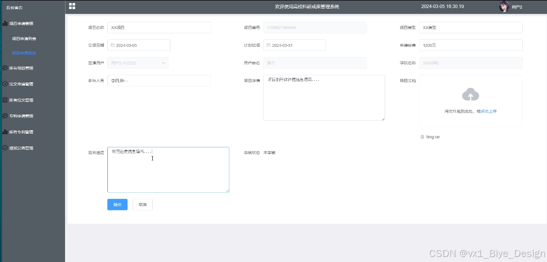 - 项目申请管理:可查看提交的项目申请信息,进行增改删查操作,支持项目名称、项目类型、审核状态搜索,添加提交项目申请信息(项目名称、项目类型、立项时间、计划结语、申请经费、参与人员、项目详情、项目文档、项目进度)等待审核,可点击查看详情。