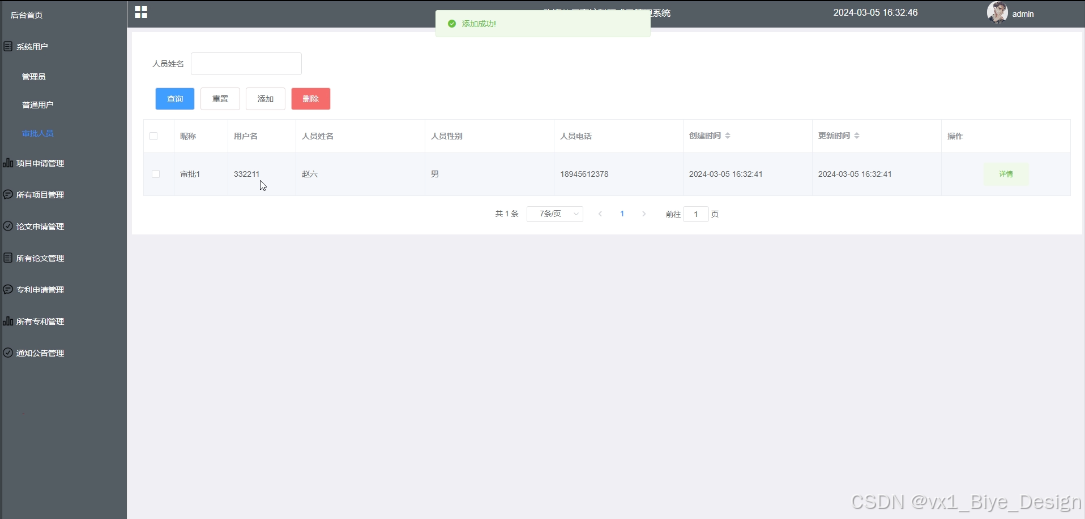 可对普通用户、审批人员和管理员进行管控,包括进行增删改查操作,点击可查看详情(头像、账号、密码、昵称、邮箱、状态、姓名、性别、电话)。其界面如下图所示。
