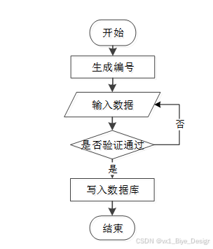 用户成功登入系统后就能够实现增加数据的操作,增加数据的编号由系统生成,用户不能随意填写,除了编号以外,其他增加信息用户自己填写,填写后的信息经过系统验证,验证通过后即可完成数据新增,数据新增的流程图如下图2-1所示。