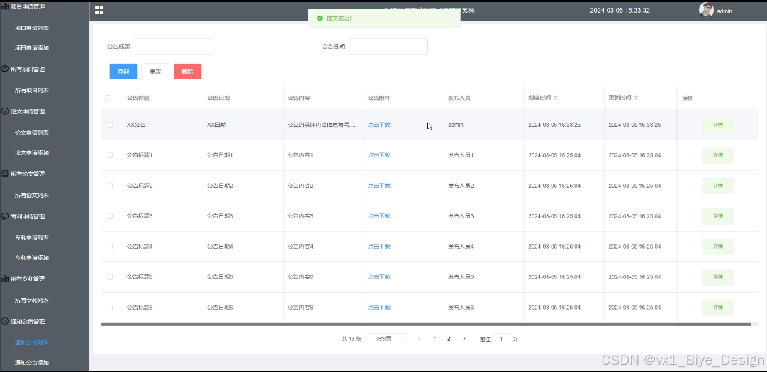 - 通知公告管理:可对通知公告进行管理,可进行查询和删除操作,支持公告标题、公告日期搜索,可点击查看详情(公告标题、公告日期、公告内容、公告附件、发布人员)。