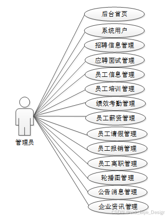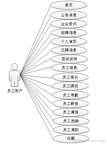 公司人力资源管理系统,系统用例分析包括员工用户和管理员的各项功能需求和交互场景。员工用户可以包括个人信息管理、公告消息查看、招聘信息浏览等功能,而管理员则需包括后台管理、用户权限管理、员工信息管理等功能。通过系统用例分析,可以明确不同用户角色的操作流程和功能需求,帮助开发团队深入了解系统的业务流程和用户需求,有效指导系统设计和开发,确保系统能够满足用户需求并提供高效的人力资源管理功能。用户角色的用例展示如图2-1所示。