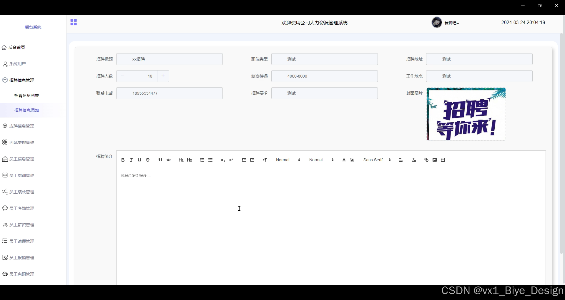 管理员发布、编辑和删除公司的招聘信息。管理员可以添加新的招聘岗位、更新职位描述和要求、设置招聘截止日期等。通过该功能,管理员可以实时管理公司的招聘需求,吸引和筛选合适的人才,提高招聘效率和质量。招聘信息管理功能也支持管理员对已发布的招聘信息进行修改和调整,保持信息的准确性和及时性,为公司招聘流程的顺利进行提供有力支持。界面如下图所示。