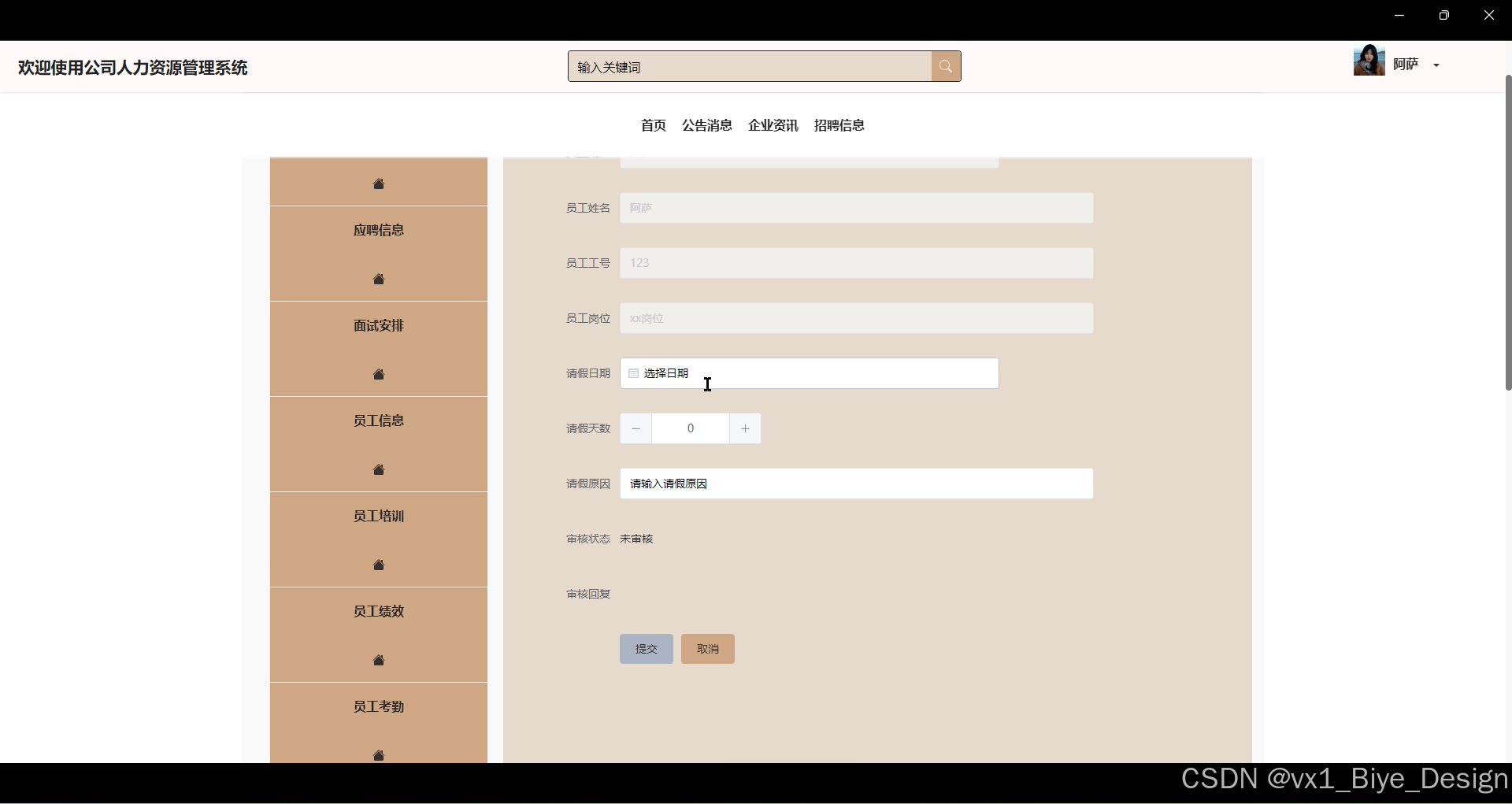 - 员工请假申请:员工可提交请假申请并查看请假审批进度,方便请假管理和工作安排。