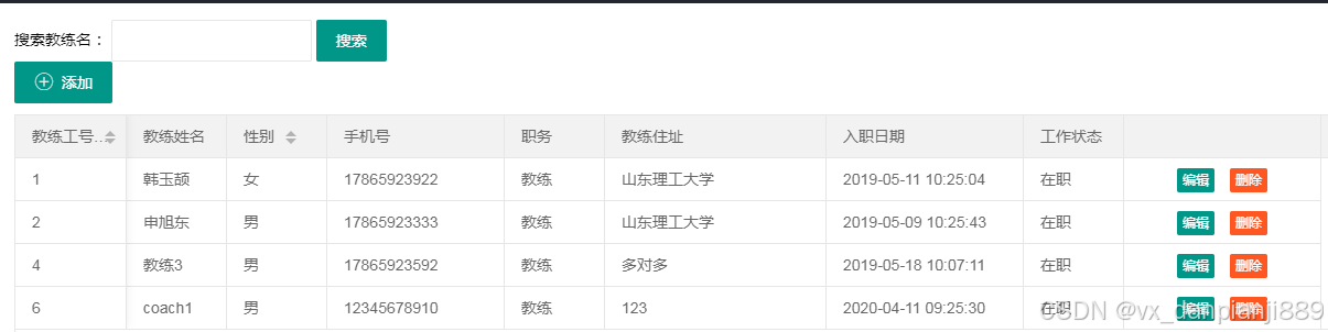 1.教练信息查询:支持按姓名、教练编号、工作经验等条件进行筛选和搜索,提供快速、精准的信息查询功能,方便管理员查找和浏览教练信息。