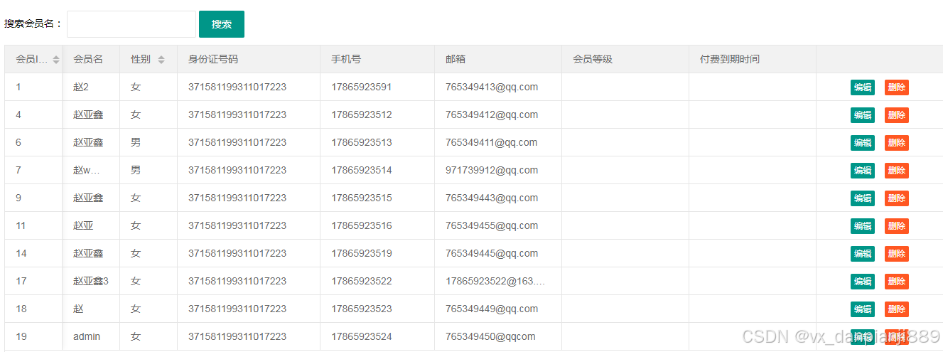 1.会员信息查询:管理员可以通过会员管理功能查询系统中的会员信息,支持按姓名、会员编号、注册时间等条件进行筛选和搜索,提供快速、精准的信息查询功能,方便管理员查找和浏览会员信息。
