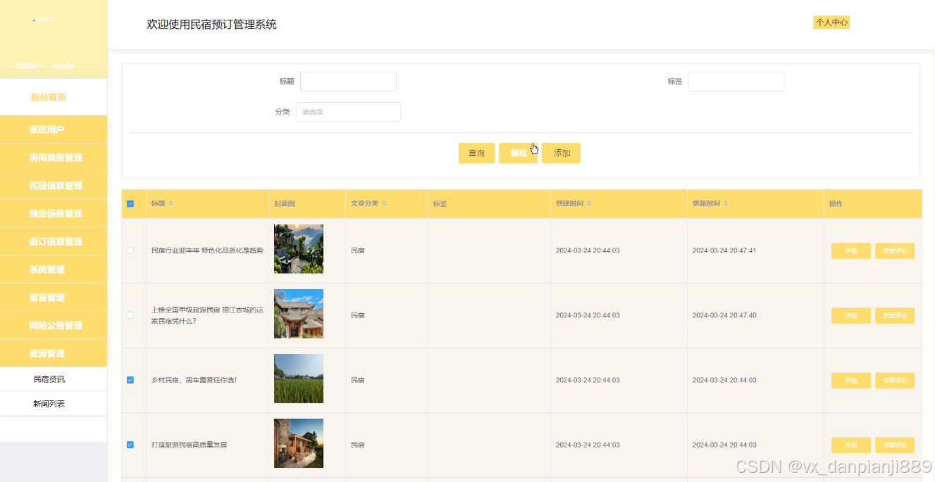 资源管理功能:资源管理功能是系统中对民宿资讯和新闻进行管理的模块。管理员可以发布民宿资讯和新闻,包括添加、删除和修改资讯内容。管理员还可以对发布的资讯进行分类、查询和详情查看操作。同时,管理员还可以管理用户对资讯的评论,包括查看、删除和回复评论内容,以确保资讯的质量和互动性。资源管理界面如下图所示。