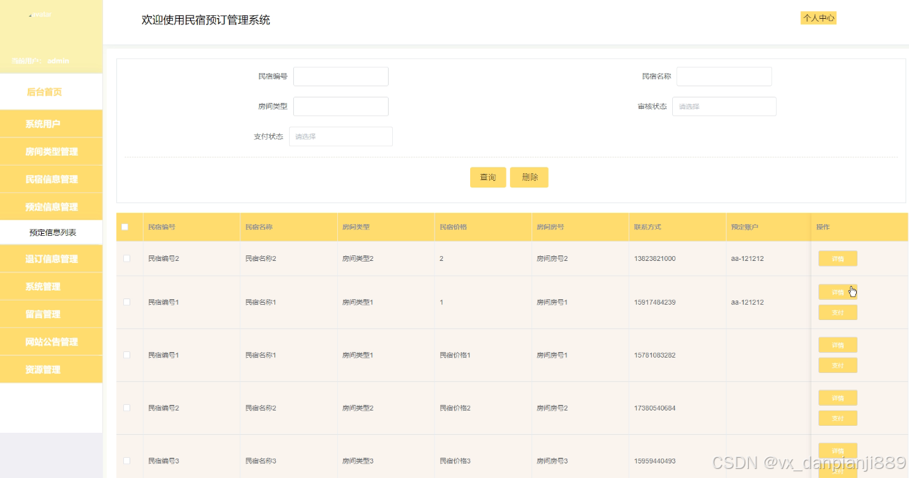 预定信息管理:预定信息管理功能是系统中的重要模块之一,它允许管理员对用户的预定信息进行管理和处理。管理员可以查询预定信息,包括预定时间、房间类型、用户信息等,并对其进行删除和详情查看操作。同时,管理员还可以处理用户的支付状态和审核预定信息,确保预定的准确性和有效性。预定信息管理界面如下图所示。