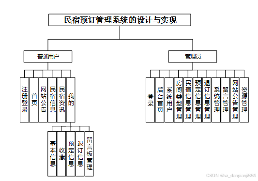 民宿预订管理系统小程序我划分为了普通用户模块和管理员模块两大部分。