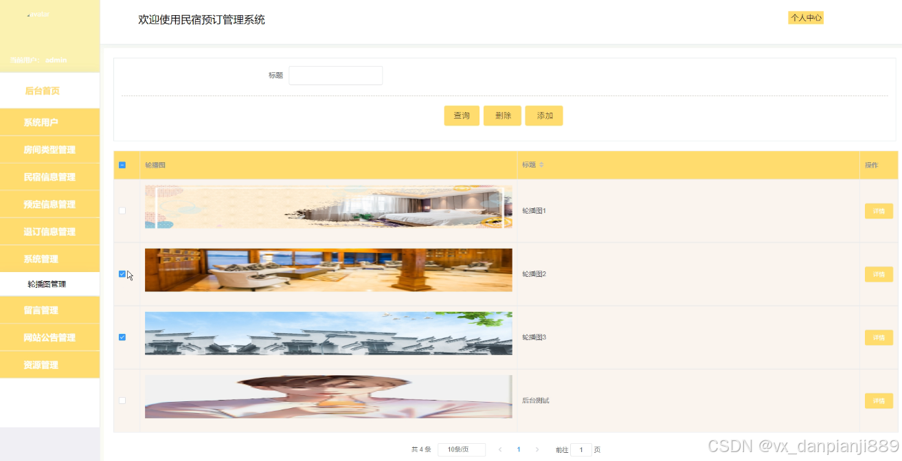 管理员在“系统管理”页面中可以对前台发布的轮播图进行增删改查的操作。系统管理界面如图所示。