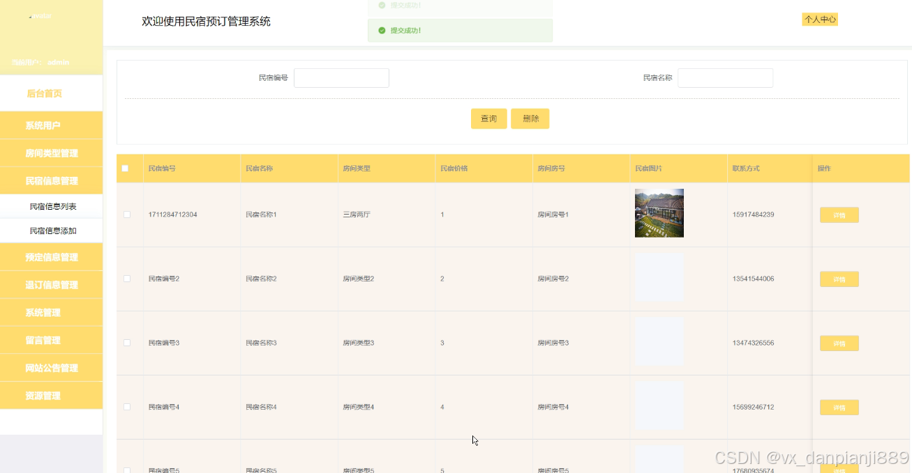 - 民宿信息管理:民宿信息管理功能允许管理员对系统中的民宿信息进行管理和维护。管理员可以查询民宿信息,包括民宿名称、地址、价格、设施等,并对其进行添加、删除和修改操作。同时,管理员还可以查看每个民宿的详情信息,以便更好地了解和管理民宿资源。