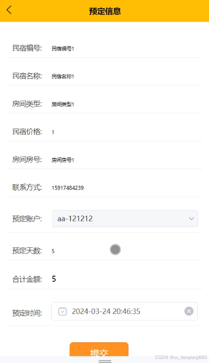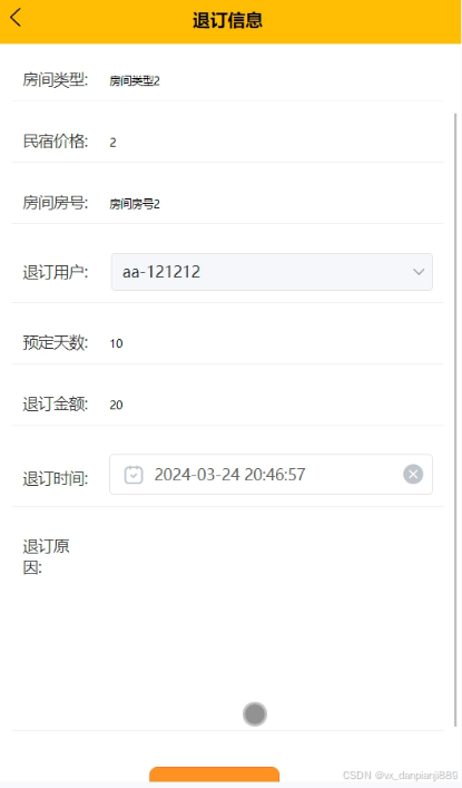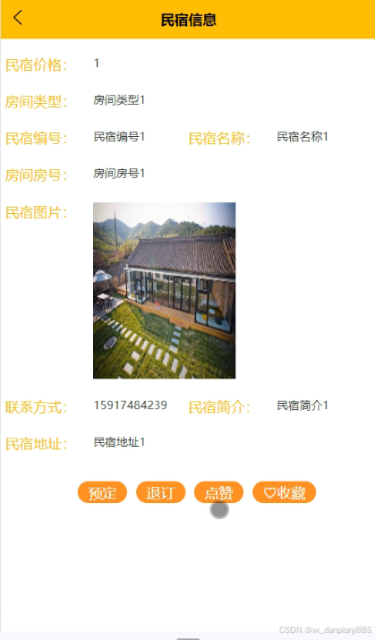 - 民宿信息:在民宿信息页面,用户可以查看详细的民宿介绍,包括民宿的特色、设施、服务等信息。用户还可以根据自己的需求进行预定操作,选择合适的民宿并填写入住时间和人数等信息。同时,用户还可以对喜欢的民宿进行点赞和收藏操作,方便日后快速找到。如果用户的计划有变,也可以进行退订操作,系统会相应地处理退订请求。