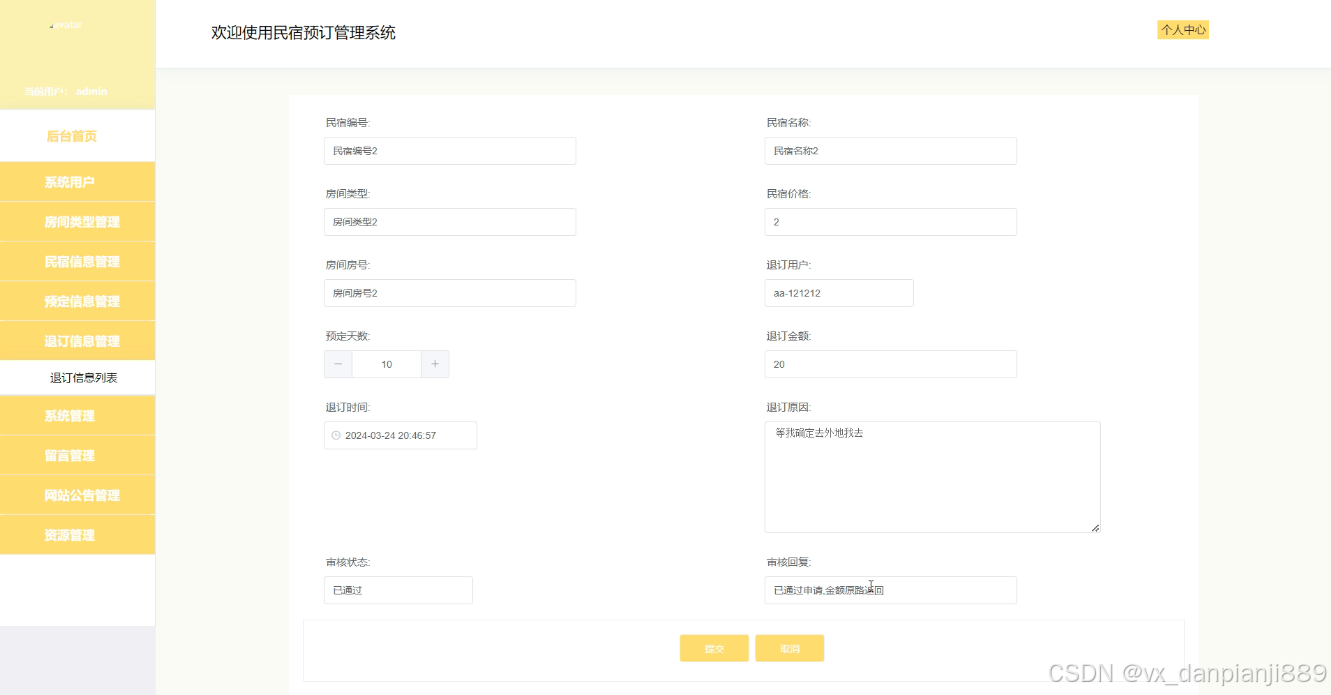 - 退订信息管理:退订信息管理功能允许管理员对用户的退订信息进行管理和处理。管理员可以查询退订信息,包括退订时间、房间类型、用户信息等,并对其进行删除和详情查看操作。同时,管理员还可以对退订信息进行审核,确保退订的合理性和准确性。
