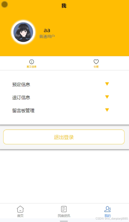 我的:“我的”页面是用户的个人中心,这里展示了用户的基本信息、收藏、预定信息等。在预定信息部分,用户可以查看预定的详细信息,包括民宿名称、入住时间、支付状态等。如果用户需要退订或修改预定信息,也可以在这里进行操作。此外,用户还可以管理自己的留言板,查看和回复留言。我的界面如下图所示。