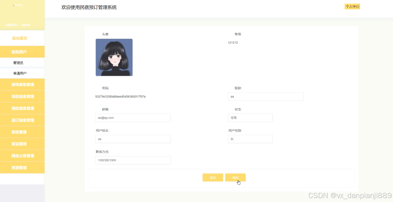 - 注册登录:注册登录功能允许用户创建个人账户并安全登录系统。注册时,用户需要填写必要的个人信息,并设置密码,以确保账户安全。登录后,用户可以享受个性化的服务,如预定民宿、查看收藏、管理预定信息等。