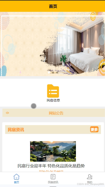 - 首页:首页是用户访问网站时首先看到的页面。这里集中展示了民宿信息,方便用户快速了解。此外,首页还设有网站公告和民宿资讯板块,提供最新的活动信息和民宿行业动态。