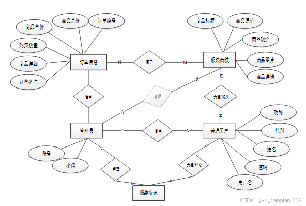 在数据库概念模型设计的时候,一般都采用E-R实体图进行展示,在实体图中可以展示出数据库表中的所有字段名称。下面是整个网上服装商场系统中主要的数据库表总E-R实体关系图。