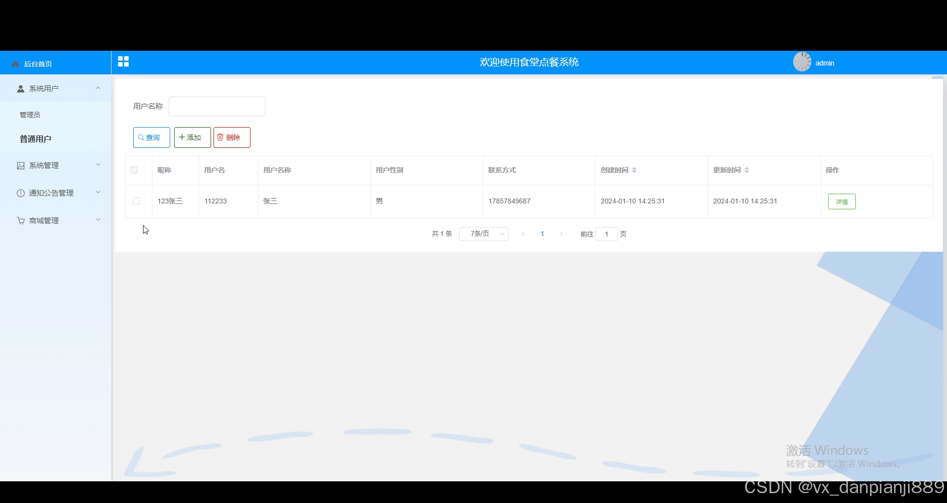 管理员拥有食堂点菜系统的最高管理权限,管理小程序的所有用户信息和权限,包括管理员和用户,用户管理界面如下图所示。